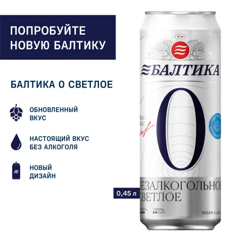 «Балтика №0» - это классический светлый лагер с насыщенным и освежающим солодово-хмелевым вкусом, только без алкоголя. Для варки Балтики 0 используются особые дрожжи, которые позволяют повторить технологию варки обычного пива. «Балтика №0» содержит минералы и витамины В, А и Е, которые помогают восстановиться после физической и умственной активности. 100% солод. Содержит всего 30 ккал на 100 г.