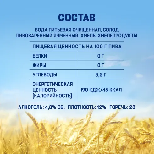 вода питьевая очищенная, солод пивоваренный ячменный, хмель, хмелепродукты