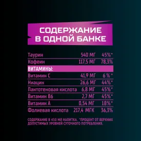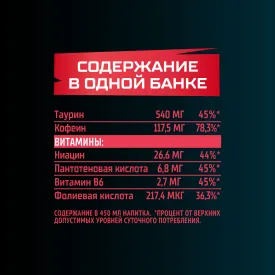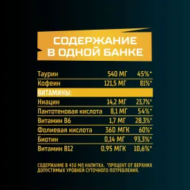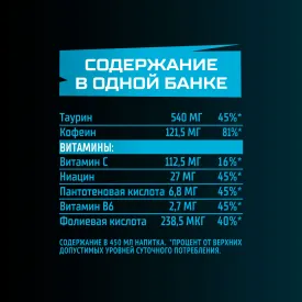 Вода питьевая очищенная, сахар, вкусо-ароматическая основа «Апельсиновый ритм» (таурин, ароматизатор, витамин C, кофеин, ниацин, пантотеновая кислота, бета-каротин, витамин B6, фолиевая кислота), регулятор кислотности кислота лимонная, антиокислитель кислота аскорбиновая, сок концентрированный апельсиновый, консерванты: сорбат калия и бензоат натрия
