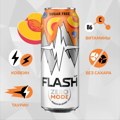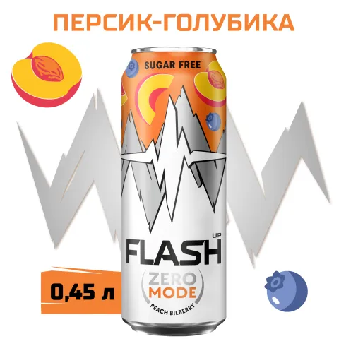 Flash Up Zero Mode Peach-Bilberry - новый тонизирующий напиток без сахара. Свежий микс, в котором идеально сочетаются сочный персик и спелая голубика. Для тех, кто ценит легкость и яркость вкуса