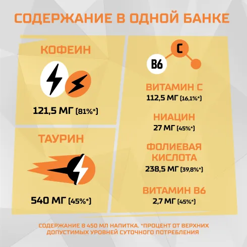 вода питьевая очищенная, регуляторы кислотности: лимонная кислота, аскорбиновая кислота и цитрат натрия, таурин, вещества вкусоароматические, в том числе натуральные, кофеин ангидрид, стабилизаторы: гуммиарабик, Е445, витамины: витамин В3, витамин В5, витамин В6, витамин В9, красители: антоцианин, бета-каротин, сок концентрированный осветленный персиковый, сок концентрированный голубики, консерванты: сорбат калия и бензоат натрия, патока крахмальная, подсластители: фруктоза, декстроза, сукралоза, цикламат натрия, ацесульфам калия, сахарин.