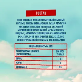 вода питьевая очищенная, сок яблочный концентрированный, сироп глюкозно-фруктозный, регулятор кислотности кислота лимонная, краситель сахарный колер I простой, ароматизатор натуральный «Яблоко»