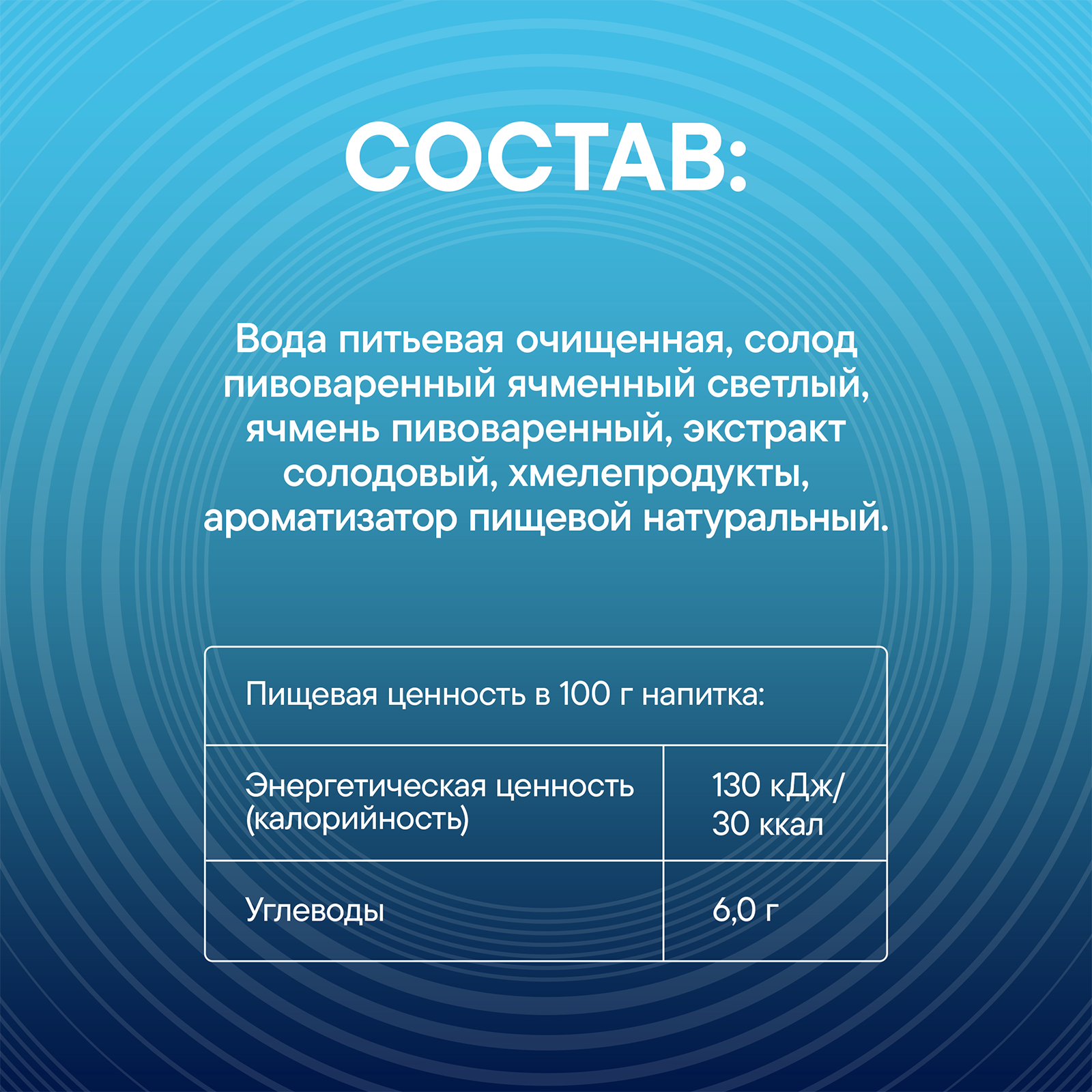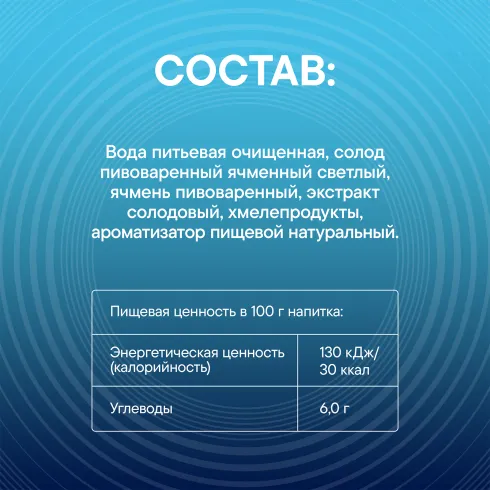 вода питьевая очищенная, солод пивоваренный ячменный светлый, ячмень пивоваренный, экстракт солодовый, хмелепродукты, ароматизатор пищевой натуральный.