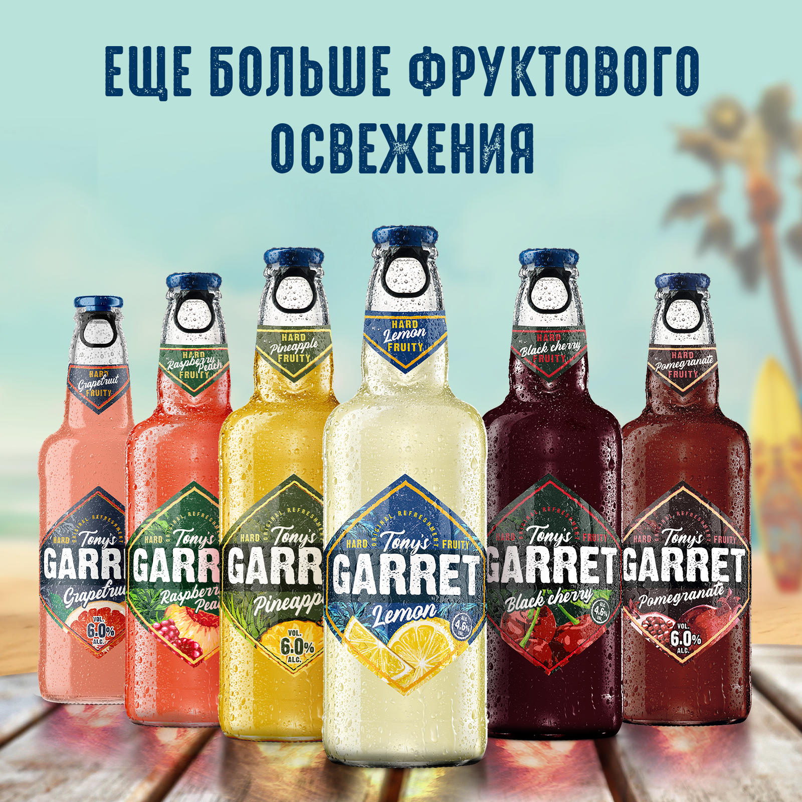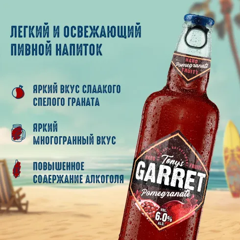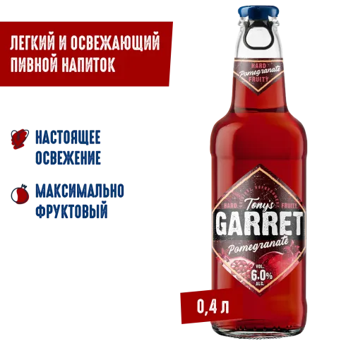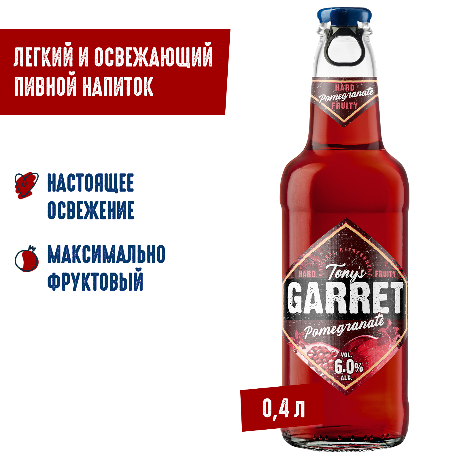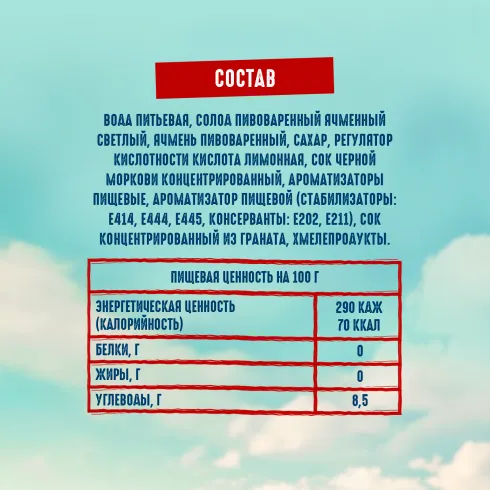 вода питьевая, солод пивоваренный ячменный светлый, сахар, регулятор кислотности лимонная кислота, сок черной моркови концентрированный, ароматизаторы пищевые, ароматизатор пищевой эмульсионный (стабилизаторы: E414, E444, E445, консерванты: Е202, Е211), сок концентрированный из граната, хмелепродукты.