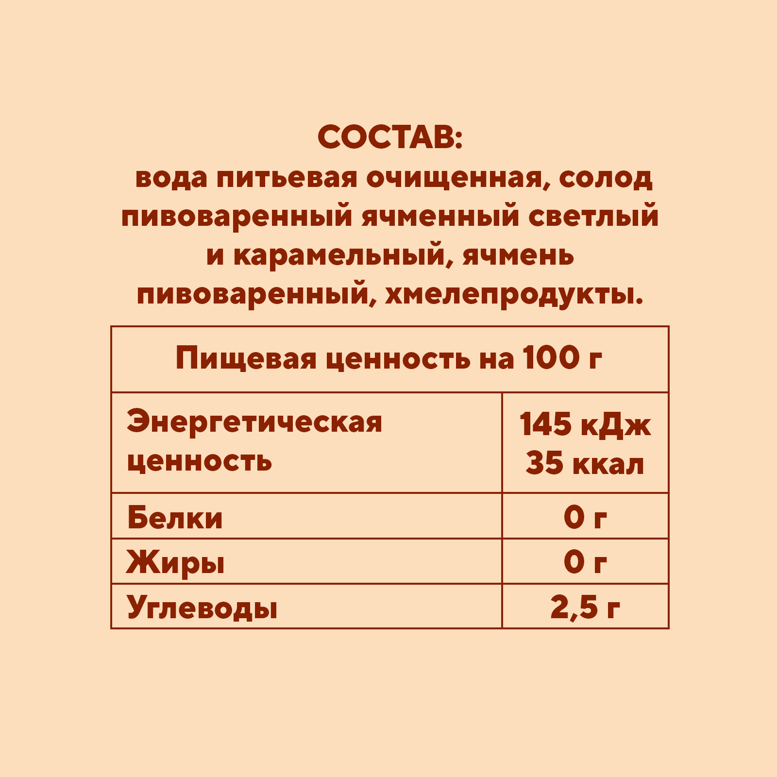 вода питьевая очищенная, солод пивоваренный ячменный светлый и карамельный, хмелепродукты.
